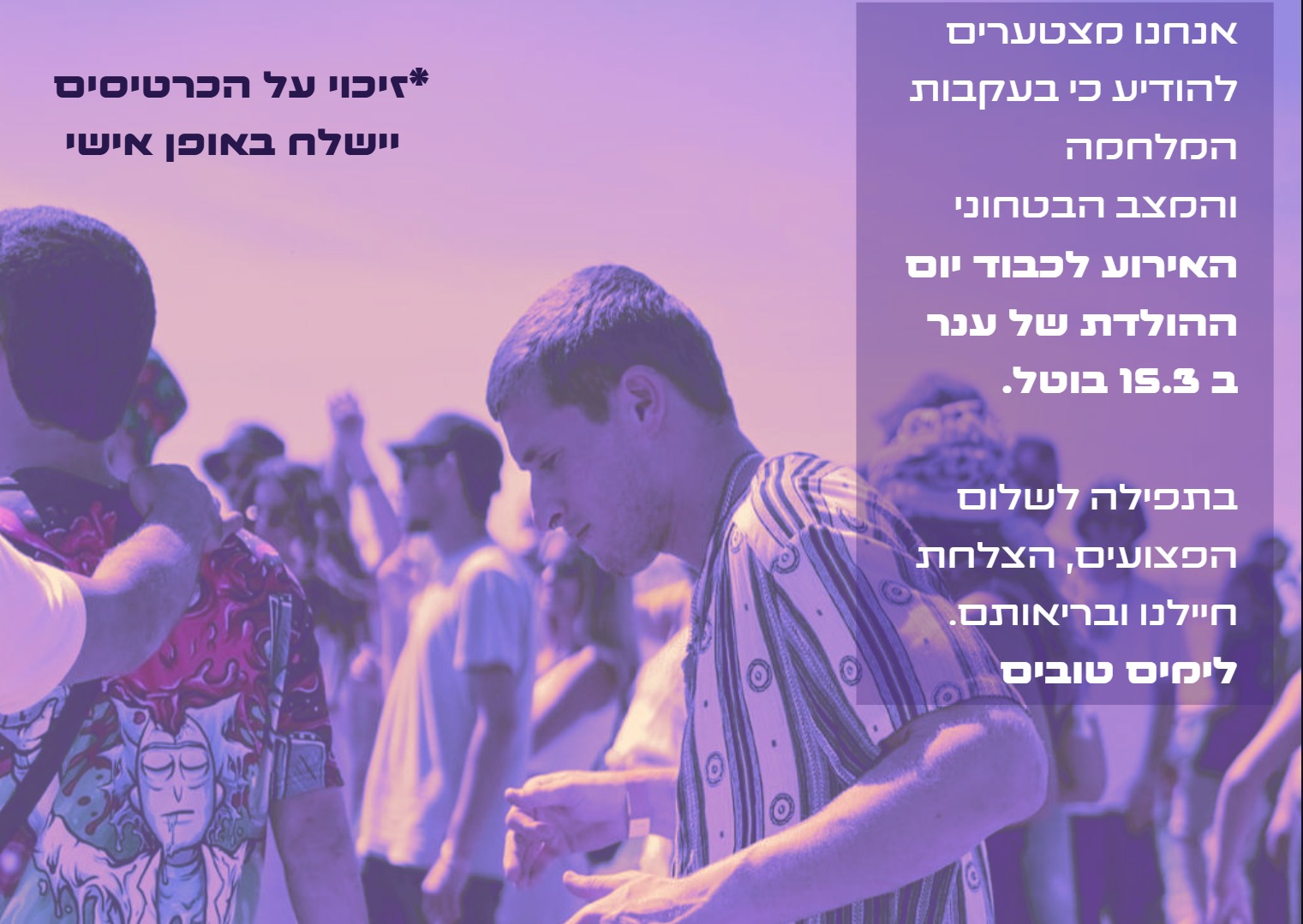 ענר סיים את חייו כגיבור, מנהיג אמיץ העשוי ללא חת, וכך ייזכר. אבל אנחנו רוצים שתכירו ותזכרו גם את האדם שהיה, ענר המוזיקאי, הראפר, הוגה הדעות, הצייר, אוהב האדם, רודף הצדק ופועל למענו. ענר בעל הלב הפתוח, העיניים הסקרניות, ההומור השנון והחיוך הכובש.